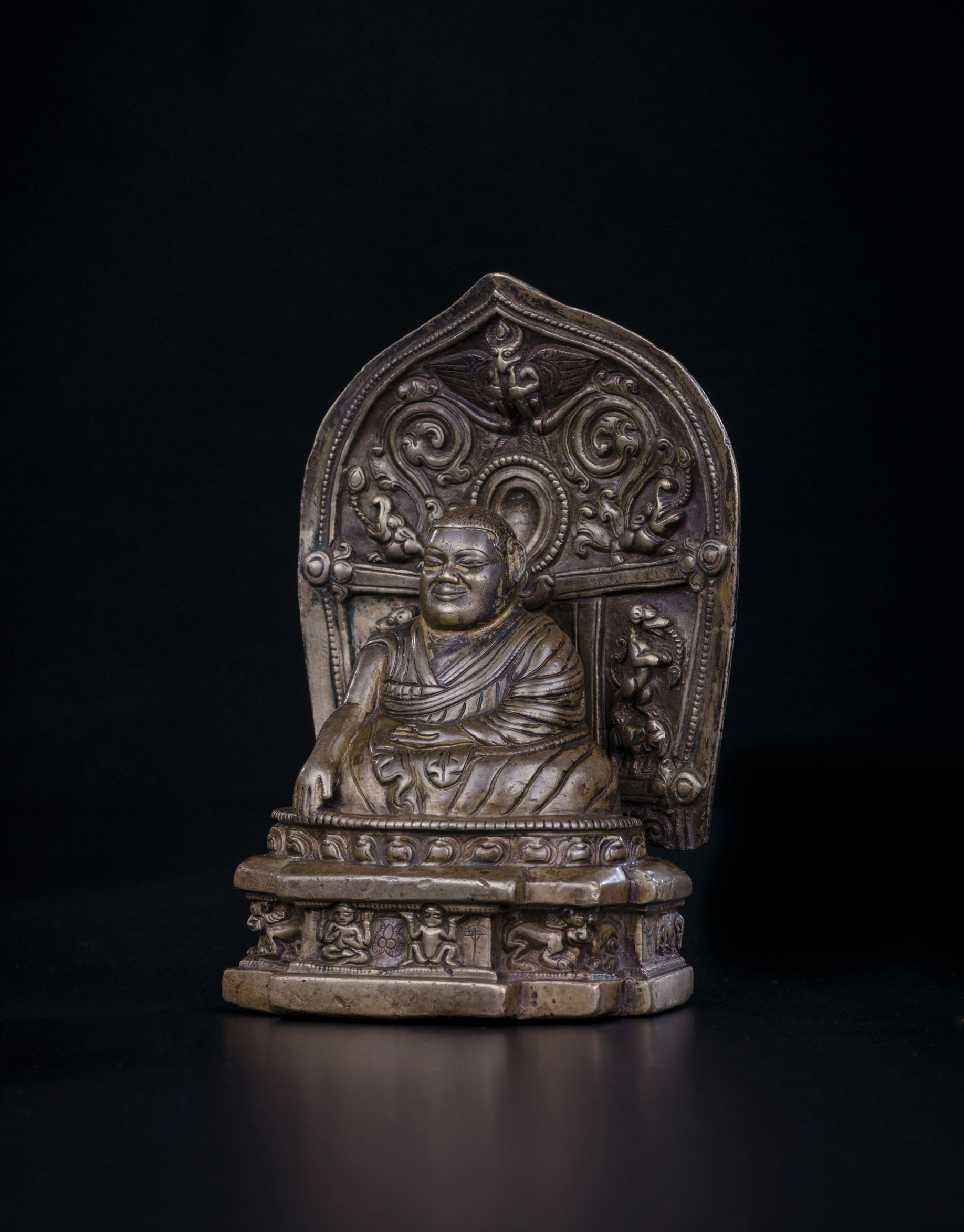 本件上師像通體由合金銅鑄造,包漿瑩潤,銅色古樸。身著楚巴,面容輪廓圓潤,神態慈祥。左手持禪定印,右手施觸地印。上師全跏趺坐于單層仰蓮座上,蓮座下還有一方形台座,台座正中有兩尊低級尊神,做上舉姿。台座兩側有護法獅子和大象,背光正面高浮雕迦陵頻伽、摩羯、獅子、大象圖像。