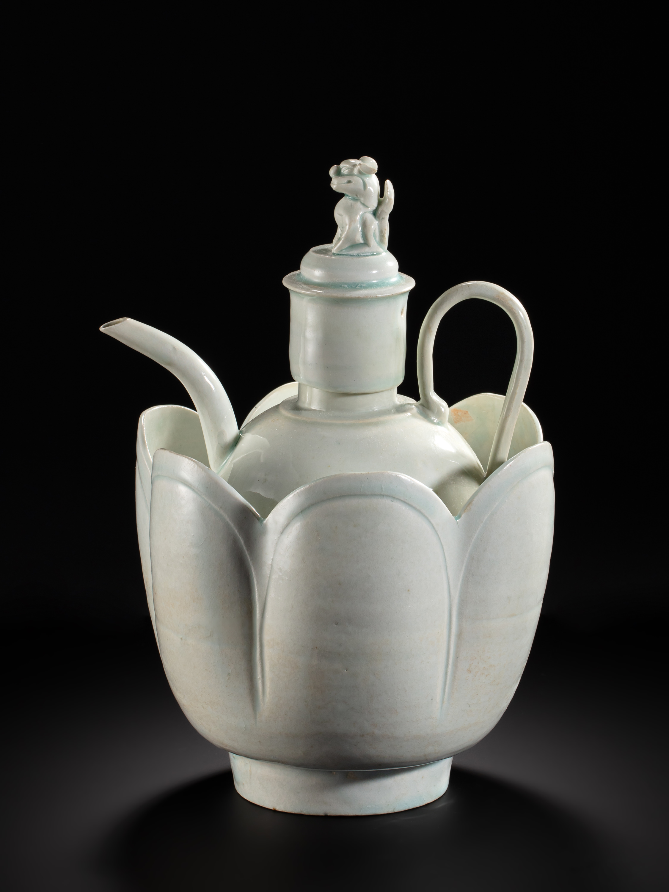 备注:此件拍品附上海捍真热释光报告 温壶由执壶和温碗上下两部分组成,执壶为分酒器,温碗有注热水保温和注冷水冰镇两种功用。此件注子盖顶塑一狮钮,身姿灵动可爱;温碗深形,花口圈足。壶身光素,温碗作六瓣花口,浑然一体。如此件器形完美的成套温壶实属罕见,功能上究极精妙,工艺难度高超,匠心独具,充分展现了青白瓷器的高超工艺,为存世较少的器物,有很高的收藏价值。