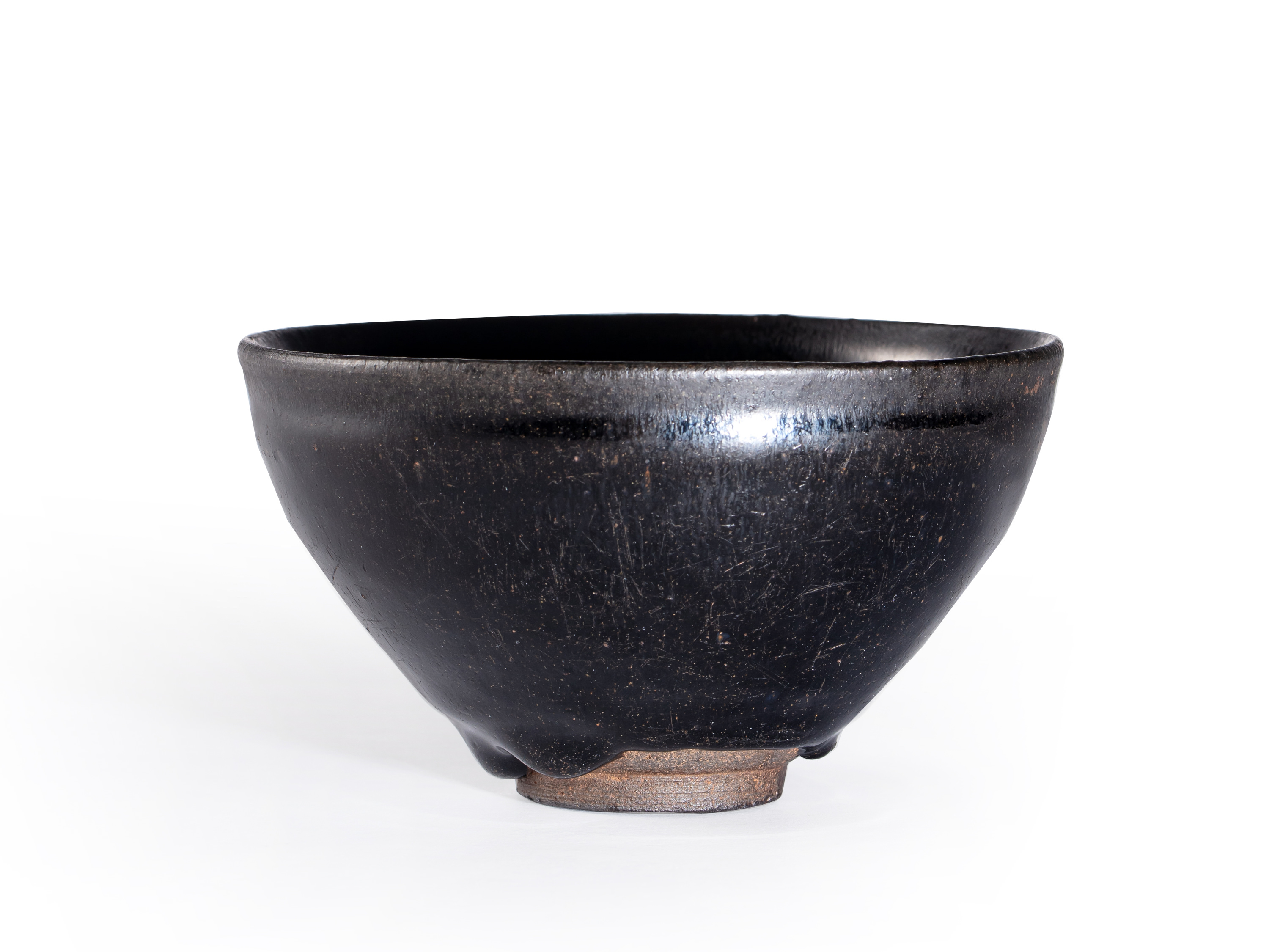 继远美术(据包装盒) 建窑茶盏,亦称天目茶碗,是饮茶文化与斗茶活动中备受推崇的器具,深受徽宗、文人雅士、官员乃至普通民众的喜爱。这一时期的建窑茶盏,不仅工艺精湛,而且款式多样,其中包括了如曜变天目、油滴天目等珍稀神品。 徽宗赵佶精通茶道。他的《宫词》里对建盏赞到:“兔毫连盏烹云液,能解红颜入醉乡。”蔡襄在《茶录》中记载:“茶色白,宜黑盏,建安(即今建阳)所造者绀黑,纹如兔毫,其坯微厚,熁之久热难冷,最为要用。出他处者,或薄或色紫,皆不及也。” 《宣和遗事》一书详细记载了这样一个史实:“(徽宗政和二年)夏四月,皇帝设宴招待蔡京,并赐以惠山泉之水,配以建溪出产的异毫盏(即建窑兔毫盏),用以烹煮新贡的太平嘉瑞茶。” 这一记载明确表明,在徽宗时期,建窑所产的兔毫盏已经作为珍贵贡品进入宫廷,成为皇室御用的茶具。 此盏造型撇口收腹,弧线优美。罩施黑釉,色泽深沉悠远,盏壁外刷釉至下腹,足部露胎,胎骨质坚,呈煤黑色。盏内外可见大大小小长短金丝银斑,似天幕中的繁星点点。