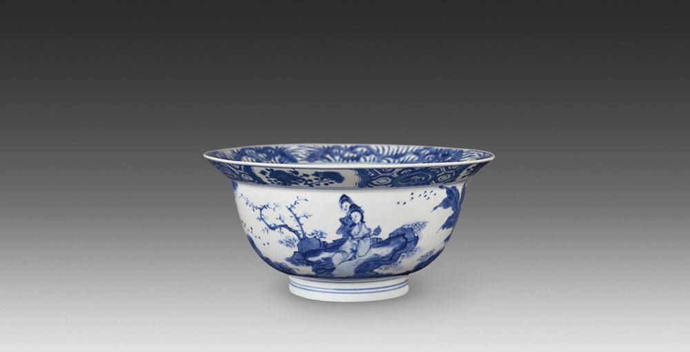 “大清康熙年制”青花款。廣口折沿,深腹,束腰,圈足。胎質细腻,胎體輕薄,口沿繪一周折枝花卉紋,內繪青花嬰戲圖,外壁繪仕女圖。釉色光潤鮮亮,青花藍豔奪目,一如新出,风格典型。