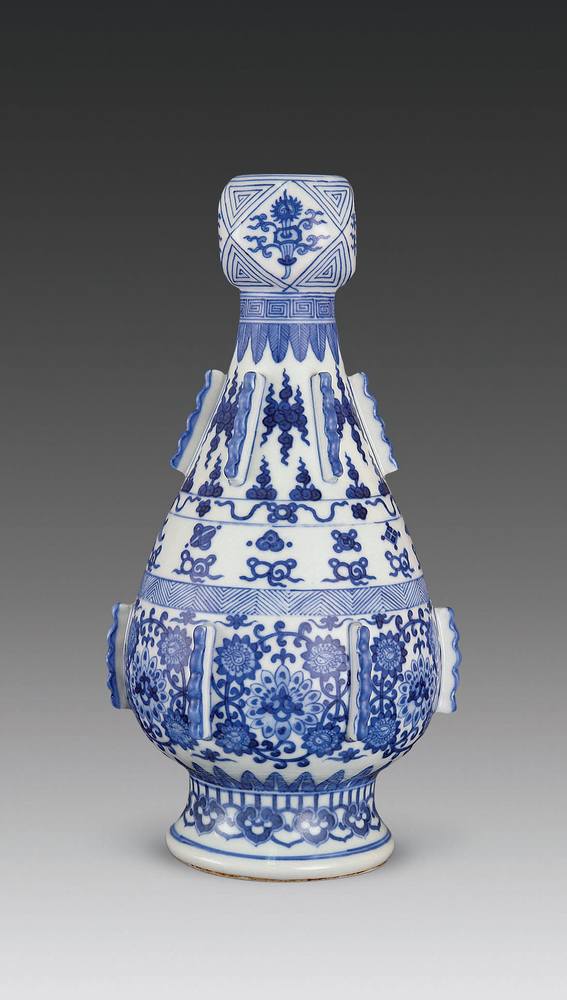 大明万历年制”寄托款。口呈鼓形,上端带五孔,腹部斜下收呈锥形,器身上下共出十二只戟,高足外撇,圈足。口部绘开光菊花纹,颈部和近底处饰回纹蕉叶纹及如意云头纹,腹部饰暗八仙缠枝花卉纹。青花发色深沉艳丽,色深处蓝中泛紫。造型别致,极其少见,保存完好,在同时期作品中实属罕见之物。