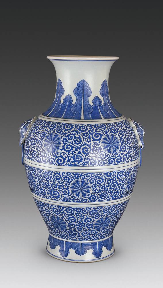 “大清乾隆年制”底款。撇口,束颈,圆肩、两侧有兽耳,鼓腹向下斜收,圈足。颈部与近足处绘蕉叶纹,腹部通体饰缠枝西番莲纹,画工精致饱满,造型稳重,保存完美,足弥珍贵。