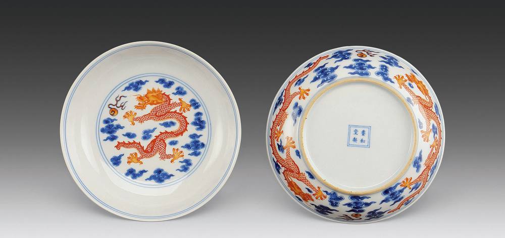 青花矾红龙纹盘(一对)