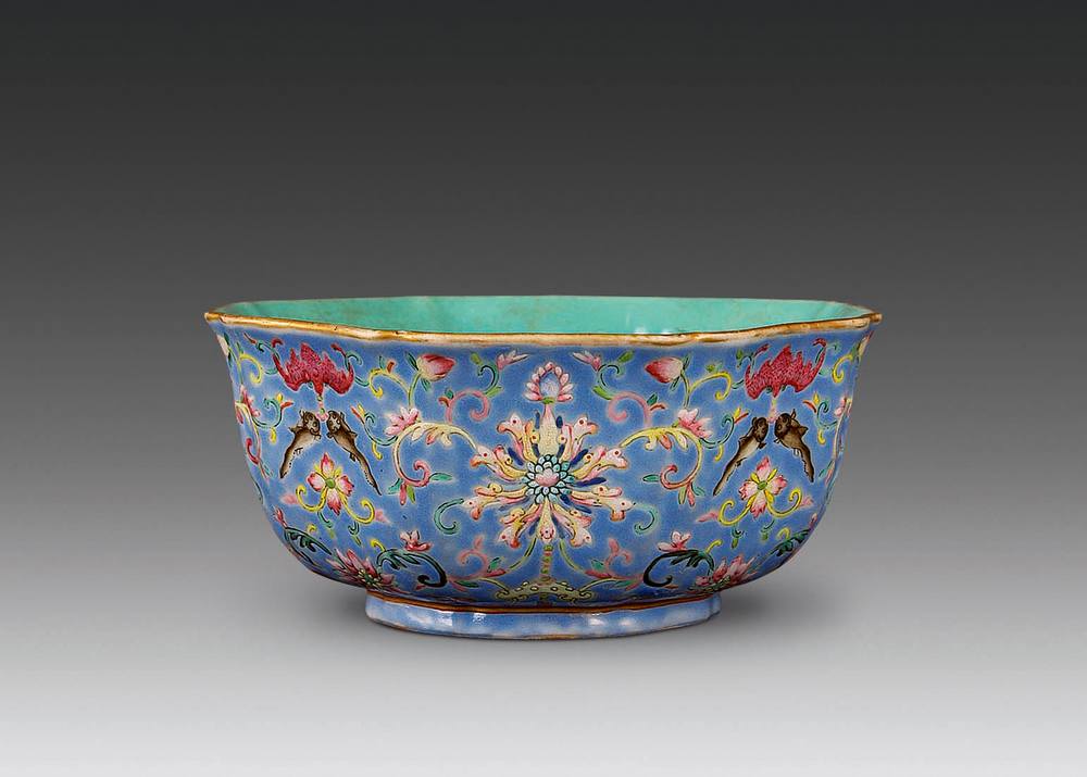 蓝地粉彩八方碗