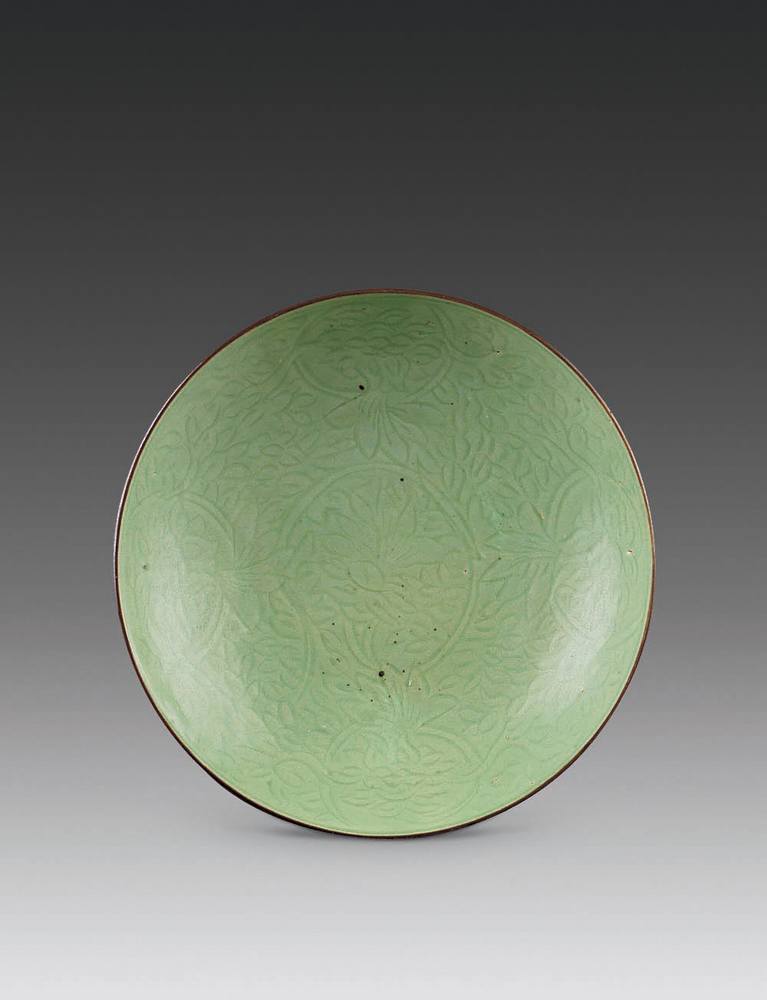 盘口翻沿,腹下收,圈足。盘心模印双鱼凸花,通体施粉青釉,足部露胎处泛火石红。聚釉处呈梅子青色,釉色甚佳,体现出宋代龙泉窑的鼎盛发展。