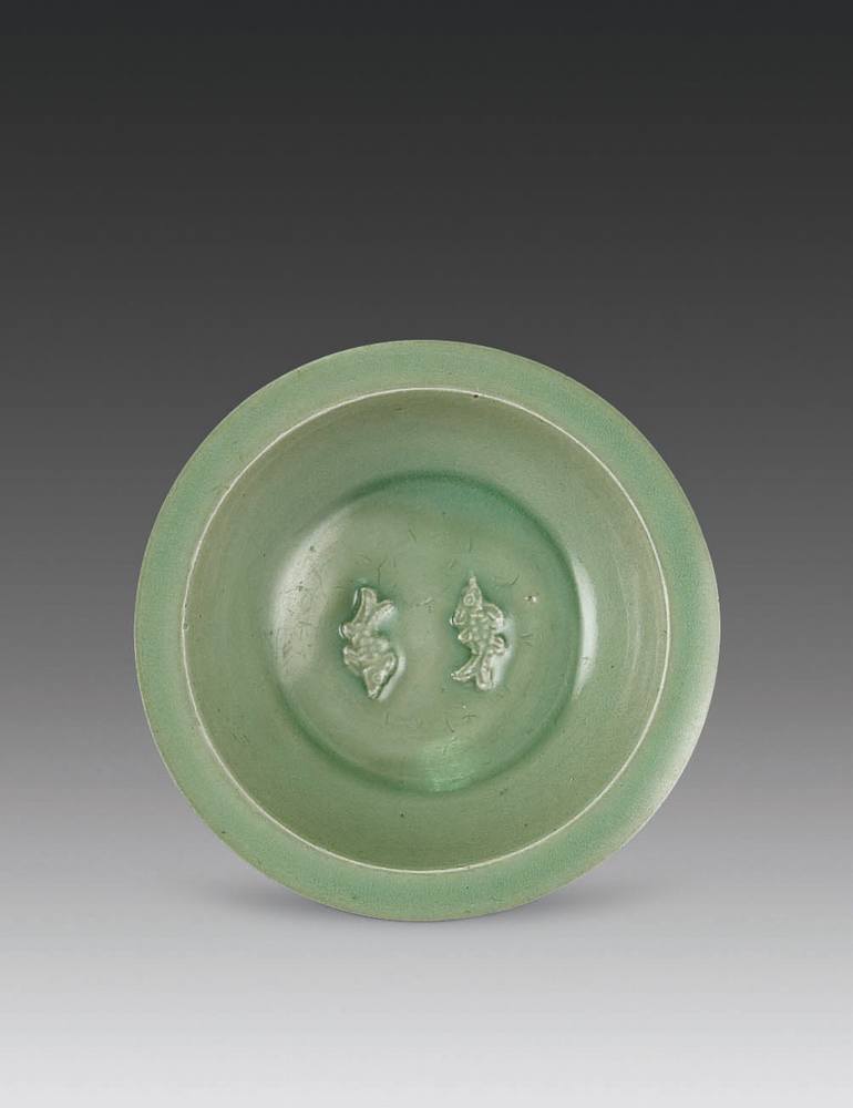 “大明永乐年制”青花双圈款。敞口,弧形浅腹,圈足。口部施酱釉,通体暗刻缠枝花卉纹,施冬青釉,纹式简洁流畅,釉色莹润均匀。