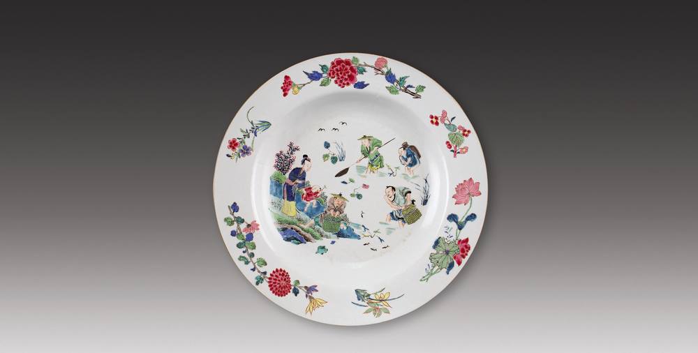 盘口折沿,浅腹,圈足,底部无釉。口沿绘粉彩折枝花卉纹,盘心绘制“渔家乐”图,题材寓意美好,人物形象生动传神,画面在浓淡色彩的衬托下,显得格外生益怏然,颇具匠心之意。此盘保存完好,为典型雍正粉彩之精品力作。