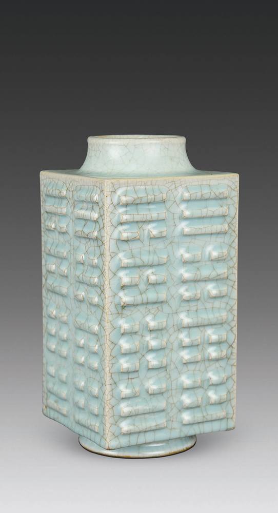 “大清同治年制”,官窑。瓶呈琮式,唇口,方身,器壁以凸花八卦纹装饰,圈足。通体及内底施粉青釉,釉色肥厚莹润,器身布满开片。琮式瓶是仿自一种古老“玉琮”,因而得名,最早出现於宋代官窑,其后历代均有仿制。该瓶造型典雅庄重,为晚清官窑颜色釉中的精品。参阅:《江西藏瓷全集》清代(下),109页