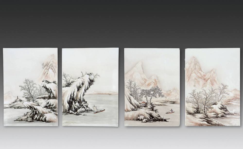 粉彩雪景山水瓷板(四片)