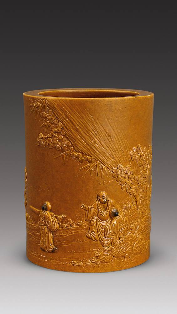 黄釉堆雕人物笔筒