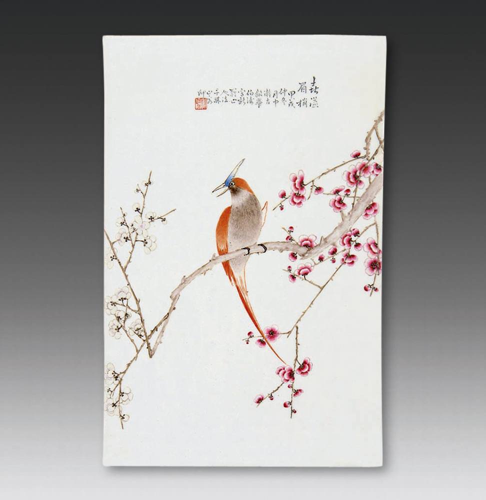 瓷板胎質細膩,釉色鮮麗。繪梅花、绶帶鳥圖。筆法工細,畫工精美,層次清晰。粉彩發色淡雅。落款为”甲戌仲冬月中浣古歙毕伯涛写新罗山人(扬州画派—华岩)法于珠山客邸“,”伯涛“白文印一枚。甲戌为1934年,作者50岁的作品。毕泊涛(1885-1951年),名达,别号黄山樵子,祖籍安徽歙县,寄居鄱阳。擅长粉彩翎毛花卉瓷画。