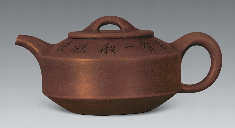 杨彭年制 底款“杨彭年制”,壶身有刻字“别有一般滋味在心头彭年作”。壶身扁鼓式,腹部变折成带形,从折边处上、下收敛至口、底,底面凹进,边缘似圈足。把圆,流微曲,盖平。造型古朴,实属收藏佳品。杨彭年,字式泉,号大鹏。清嘉庆年间制紫砂壶名艺人。荆溪人,一说浙江桐乡人,弟宝年、妹凤年,均为当时制壶名人,善于配泥,所制茗壶,玉色晶莹,气韵温雅,浑朴玲珑,具天然之趣,艺林视为珍品,当时常为溧阳知县陈鸿寿制作《曼生壶》,历来为鉴赏家所珍藏。