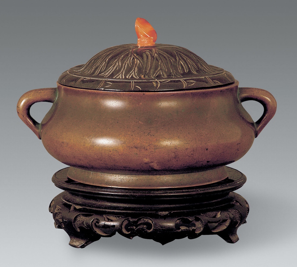 底部“宣德年制”和“疆恕堂”楷书款。圆腹,素面,肩饰双耳,圈足。器形端正、规整,材质厚重,皮色滋润。原配木盖和底座,亦规整周正,包浆温润,实为难得。