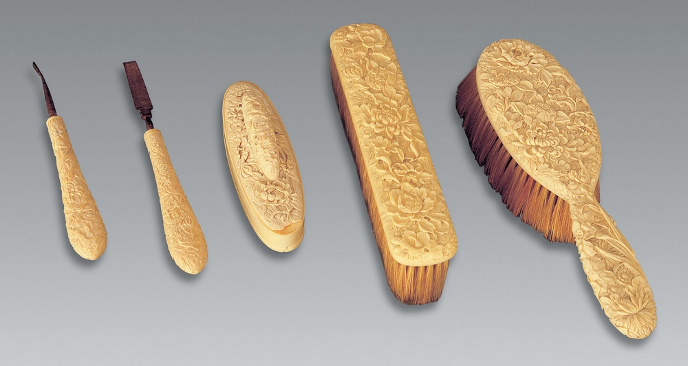 此套象牙用具选材于非洲象牙,由名匠精工雕刻,是外来使节进贡清朝末代皇妃的礼品,具有典型的18世纪欧式宫廷风格,整套用具浮雕百花纹饰,刀法娴熟,做工精细。