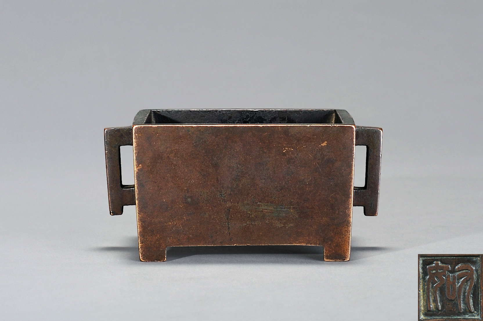 双耳四方铜炉,俗称马槽炉,自古云“马槽多佳器,私款最为精”,因马槽炉多为文人墨客订制置于书斋案上焚香盘玩之用。是器炉型方正,比例和谐,大小盈手,壁薄坠手,其原皮完整,栗殻古色,蕴神其内,跃精于外。底款“九如”二字篆书刻款,“九如”有祝贺福寿延绵不绝之意。其出自《诗经•小雅》天保篇:“天保定尔,以莫不兴。如山如皋,如冈如陵,如川之方至,以莫不增……如月之恒,如日之升,如南山之寿,不骞不崩,如松柏之茂,